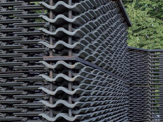 我們都知道,水泥瓦一般用作普通民房或者高檔別墅的屋頂建設(shè),但是設(shè)計師弗里達、埃斯科韋多設(shè)計的蛇形展亭,以水泥瓦建造,這種水泥瓦一般用于建造屋頂,顏色偏深而且具有獨特的質(zhì)感。展亭將水泥瓦以左右錯位、類似植物的排列方式堆疊,形成帶有墨西哥特色的鏤空墻幕。展亭的庭院中還設(shè)一個三角形的水池,屋頂?shù)紫聞t以鏡面鋪就,在日光照射